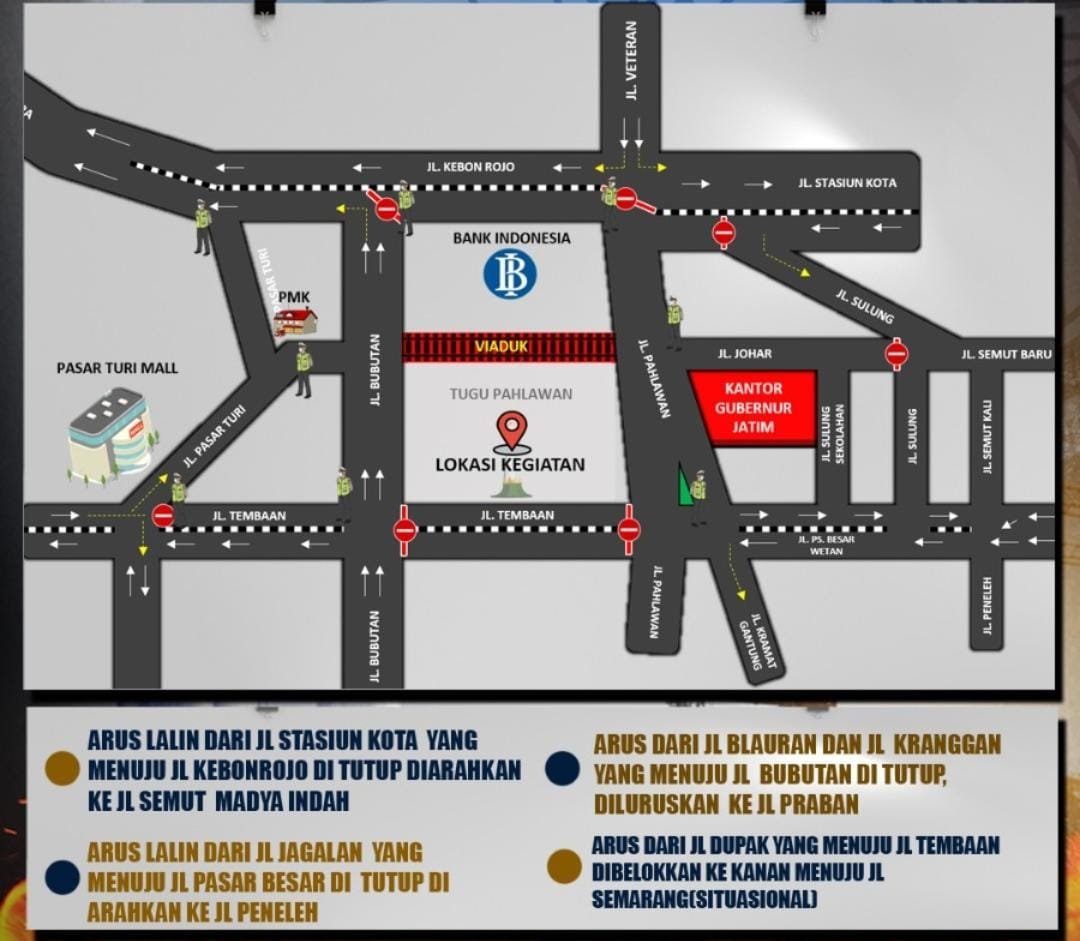 Kendaraan yang dari arah Jalan Gemblongan dan Jalan Prambon menuju Jalan Tunjungan diarahkan ke Genteng Kali.