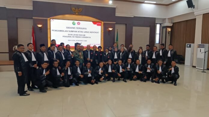 Surabaya,Globalnews9.id — Sejarah baru tercipta dalam dunia advokat Indonesia, khususnya di Jawa Timur. Untuk pertama kalinya, Persatuan Advokat Indonesia (PERADIN) melalui Badan Pengurus Wilayah (BPW) Jawa Timur melaksanakan sumpah advokat secara mandiri, tanpa bergabung dengan organisasi advokat lain. Prosesi bersejarah ini digelar di Pengadilan Tinggi Jawa Timur, Surabaya, Kamis (16/10/2025), diikuti 35 advokat baru lulusan Pendidikan Khusus Profesi Advokat (PKPA) angkatan ke-21 dan ke-22.