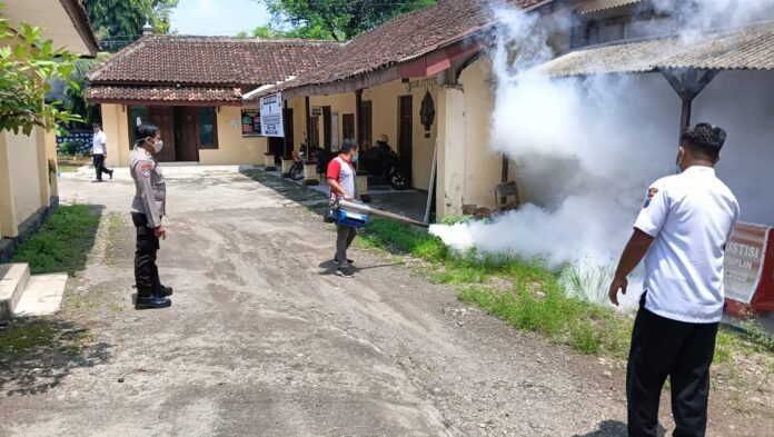 Globalnews9.id || NGAWI Memutus penyebaran wabah Demam Berdarah Dengue (DBD), seksi kedokteran dan kesehatan (Sidokkes) Polres Ngawi lakukan Fooging di lingkungan kantor Polres Ngawi.
